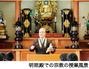 宗教の授業は主に明照殿で行われます。明照殿は、仏様が安置されている東海学園の教育のシンボルであり、宗教の授業のほかにもさまざまな宗教行事を行う神聖な場所でもあります。教科書は主に『仏教読本』を用い、人生の智慧の宝庫である仏教の教えをひもときながら、人間としての生き方について考えていきます。