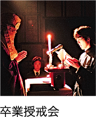 高校3年生の冬に、講堂にて厳粛に行われる伝統行事です。高校卒業を前に、「生涯仏様の御心にかなう正しい道を歩んでいけますように」と願いを込めて生徒一人ひとりが戒律を授かり、これからの人生を悔いなく歩むことを誓います。