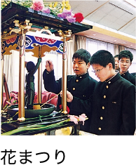 仏教三大聖日であるこれらの日は校長先生の法話を拝聴します。釈尊降誕会(花まつり)では釈尊の誕生仏に甘茶をかけてお参りします。